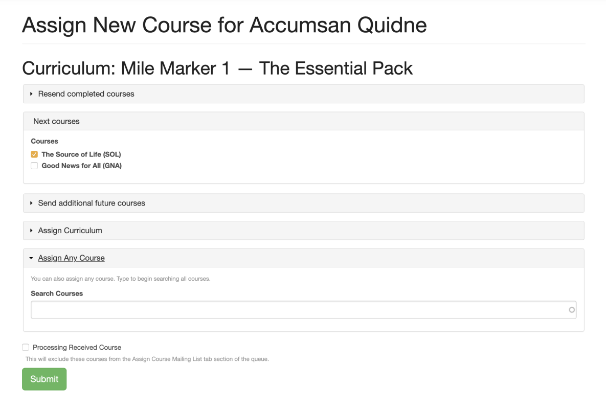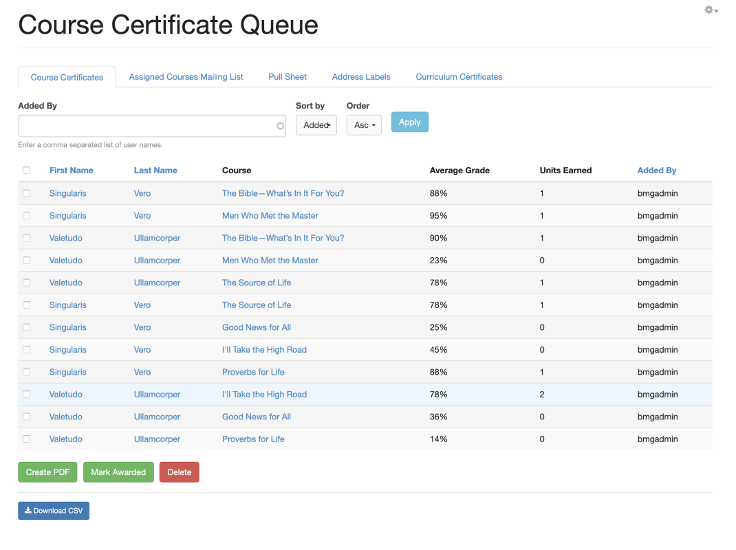 This site is a student management tool built on Drupal 7 and allows multiple ministries to manage their student's progress, assign and mail out courses, grade course progress, print out envelopes for mailings, and generate certificates for finishing courses.